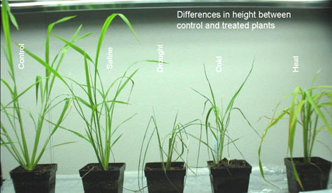 The purpose of this activity is to demonstrate the effect of changes in the environment on the growth and fertility of landscape grasses and crop grasses such as wheat and rice. You will place the plants in environments such as high salinity, cold, heat, or drought and observe the different reactions of the plants to these conditions. Students will compare the growth of treated plants to that of the control plants which are grown under optimal conditions. You will then discuss the desirability of breeding new types of plants that are better able to withstand these changes if they occur in the general environment.