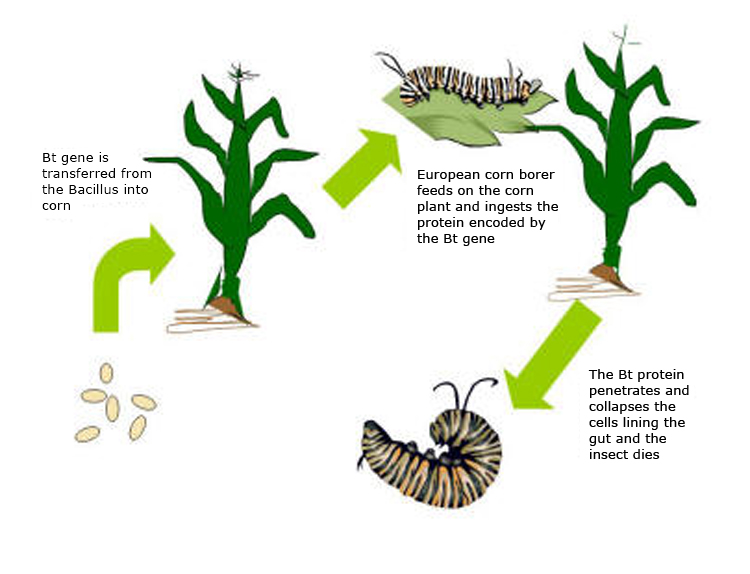 A gene (Bt) from the bacterium Bacillus thuringiensis can be inserted into a crop such as corn. When a pest such as the European corn borer begins feeding on this plant, it ingests the protein that is encoded by the Bt gene and translated in the corn plant. This protein forms crystals that penetrate the cells lining the insect's gut and the insect subsequently dies. Generally, uncontrolled pests may cause direct loss by eating leaf tissue, vascular tissue, and grain. Indirect damage may result from increasing the risk of stalk rots, ear rots, mycotoxins contamination of the grain, stalk breakage, and ear-drop.