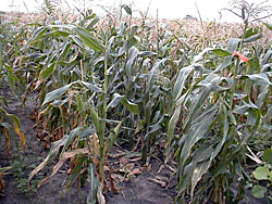 Southern corn leaf blight, caused by Race T of the fungus Bipolaris (Helminthosporium) maydis, forced US crop breeders to consider the detrimental effects of planting only one genotype of a crop. If the specific genotype used isn’t resistant to a particular invader, then the whole crop could be lost if the pathogen establishes itself in the environment. The B. maydis fungus that ravaged corn fields resulted in withered plants, broken stalks, and malformed or completely rotten cobs that were covered in a grayish powder. In 1970, almost 85% of US corn fields was planted with one type of corn, called Texas cytoplasmic male sterile (Tcms) corn. Unfortunately, this type of corn was highly susceptible to a new type (race) of the pathogenic fungus B. maydis race T. A combination of very wet weather conditions and the high susceptibility of the Tcms corn to B. maydis race T led to rapid spread of the pathogen and a devastating epidemic. The losses of corn were catastrophic, reaching as high as 50-100% in some areas of the US. The actual food energy losses were considered to be greater than those caused by the potato late blight epidemic of the 1840's. The economic losses from southern corn leaf blight disease totaled about 1 billion dollars.
