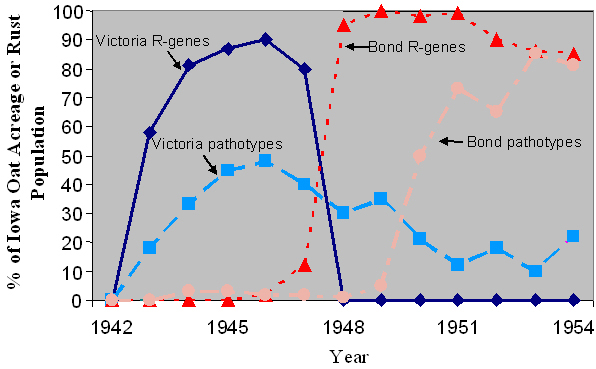 A final example comes from oat crown rust and stem rust, caused by Puccinia coronata and Puccinia graminis f. sp. avenae, respectively (Browning and Frey 1969). Following the development of Victoria blight (caused by Helminthosporium victoriae) which caused a devastating disease only on oat cultivars carrying a crown rust resistance gene originating from the oat cultivar Victoria, oat farmers rapidly shifted to new varieties carrying rust resistance derived from the oat cultivar Bond. The corresponding pathogen populations rapidly shifted from virulence against the Victoria resistance genes toward virulence against the Bond resistance genes (Figure 26).