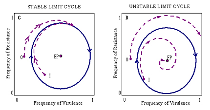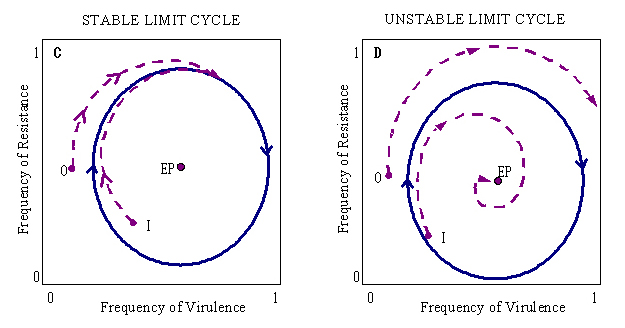 | Figure 29. Diagrammatic representations of remaining two of four patterns of gene frequency changes in hypothetical host-parasite models. C. Stable limit cycle: if gene frequencies start anywhere on the closed trajectory represented by the circle with the solid line, they remain in that trajectory as they cycle around the internal equilibrium point (EP). Gene frequencies starting outside the limit cycle (for example at point 0), spiral inward toward the limit cycle. Gene frequencies starting inside the limit cycle (e.g., point I) spiral outward toward the limit cycle. D. Unstable limit cycle: gene frequencies starting on an unstable limit cycle continue in its closed trajectory, but gene frequencies that start outside the unstable limit cycle (e.g. point 0) spiral outward toward fixation of virulence and loss of resistance. Gene frequencies that start inside the unstable limit cycle (e.g. point I) spiral inward toward the internal equilibrium point (EP). For a very large unstable limit cycle whose trajectory essentially follows the boundaries of the phase plane, nearly any initial frequencies of resistance and virulence genes lead to an inward spiral toward the internal EP. Click here for an enlarged view of this figure. |
