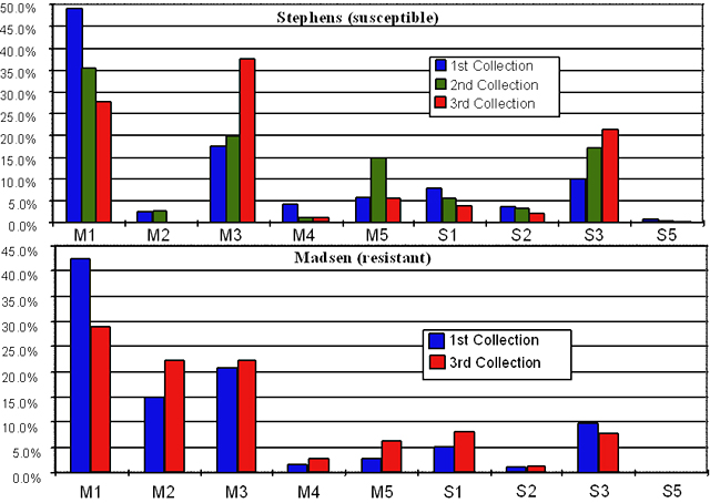 | Figure 31. Frequency of 10 inoculated Mycosphaerella graminicola isolates during the growing season on the resistant cultivar Madsen and the susceptible cultivar Stephens. Collections were made approximately six weeks apart. Click here to see an enlarged view of this figure. |