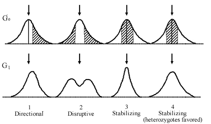 | Figure 18. Illustrations showing how four different kinds of selection affect allele frequencies. G0 is the initial allele frequency and G1 is the allele frequency following one generation of selection. |
