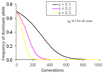 | Figure 21. Selection against a recessive allele present at an initial frequency of 0.70 in a population. The change in frequency of the allele over 1000 generations is shown for three different selection coefficients. |