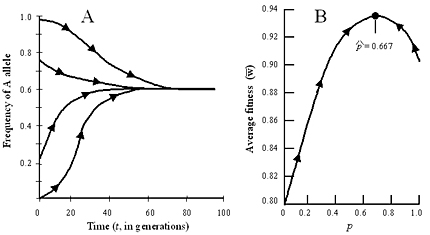 | Figure 23. Overdominance leads to stabilizing selection that maintains both alleles in a population. A) The allele frequency converges to an equilibrium value irrespective of the initial frequency. In the example, w11 = 0.9, w12 = 1 and w22 = 0.8 and the equilibrium frequency of allele A is 0.667. B) The average population fitness for different frequencies of the A allele (p). Click here for an enlarged view of this figure. |