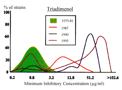 | Figure 25. Loss of fungicide sensitivity in Rhynchosporium secalis populations on UK barley (Brent and Hollomon, 1998). (Used by permission of Fungicide Resistance Action Committee- FRAC) |