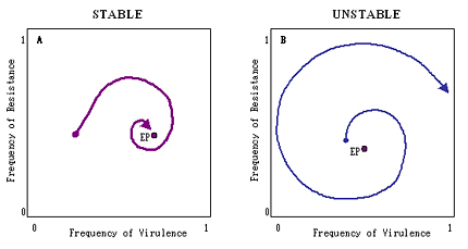 | Figure 28. Diagrammatic representations of two out of four patterns of gene frequency changes in Leonard's hypothetical host-parasite models. A. Stable equilibrium: frequencies of the resistance and virulence genes, plotted in a phase plane, spiral inward toward a stable, internal equilibrium point (EP). B. Unstable equilibrium: gene frequencies spiral outward away from an unstable equilibrium point (EP) until virulence becomes fixed in the parasite population and resistance is lost in the host population. |