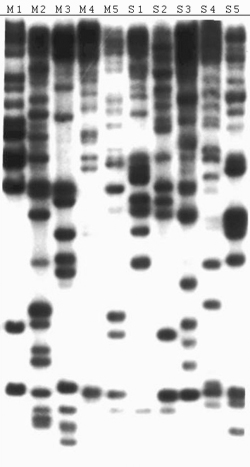 | Figure 30. DNA fingerprints of 10 Mycosphaerella graminicola strains used to inoculate field plots planted to wheat cultivars Madsen and Stephens. M1-M5 were collected from the moderately resistant host Madsen. S1-S5 were collected from the susceptible host Stephens. |