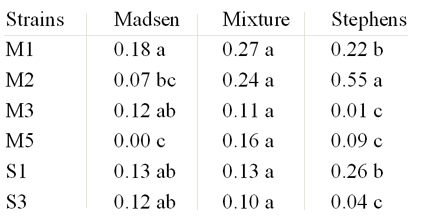 | Table 6. Selection coefficients for six Mycosphaerella graminicola strains used in a replicated field experiment. Mean values followed by different letters differ at P < 0.05. Strains with the lowest selection coefficient have the highest fitness to each host treatment. Selection coefficients of strains M4, S2, S4, and S5 were not estimated because they occurred at frequencies that were too low to be meaningful. |
