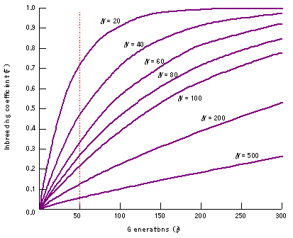 Figure 16. The relationship between effective population size and fixation index. Small populations become inbred more rapidly than large populations, often leading to inbreeding depression. After 50 generations, F=0.70 for an effective population size of 20 individuals, while F=0.05 for a population of 500 individuals. |