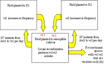 From the susceptible field, we expect to find 107 mutants from avirulence to virulence for vr1 each day that can infect the field planted to R1. Only the vr1 mutants can survive on R1, so they increase in frequency quickly by asexual reproduction. Similarly, we expect that 107 mutants from avirulence to virulence for vr2 each day can infect the field planted to R2. Only the vr2 mutants survive, and these increase in frequency on R2. After the vr1 and vr2 types cause epidemics on R1 and R2, their spores can move back into the field of susceptible barley, possibly at quite high numbers. If the vr1 and vr2 mutants are in compatible mating types, they will have a chance to cross and recombine the vr1 and vr2 alleles during meiosis. While the number of successful matings between vr1 and vr2 mutants may represent only a small proportion of the matings in the population, if these genes are unlinked, then 25% of their progeny will contain both virulence alleles. These recombinants would be able to defeat a host genotype with both the R1 and R2 resistance genes.