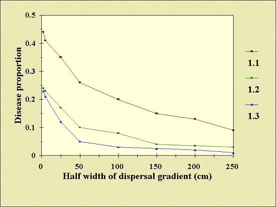 Computer simulations have illustrated that cultivar mixtures are most effective in reducing spread of diseases caused by pathogens with shallow spore dispersal gradients. This figure shows the predicted effect of the relative steepness of the spore dispersal gradient on the amount of disease in three mixtures of susceptible and resistant cultivars (ratio of susceptible to resistant cultivars = 1:1, 1:2, and 1:3) after six pathogen generations in a model simulating barley powdery mildew (Fitt and McCartney 1986). Note: steep gradients have small half widths. Click image for an enlarged view. |